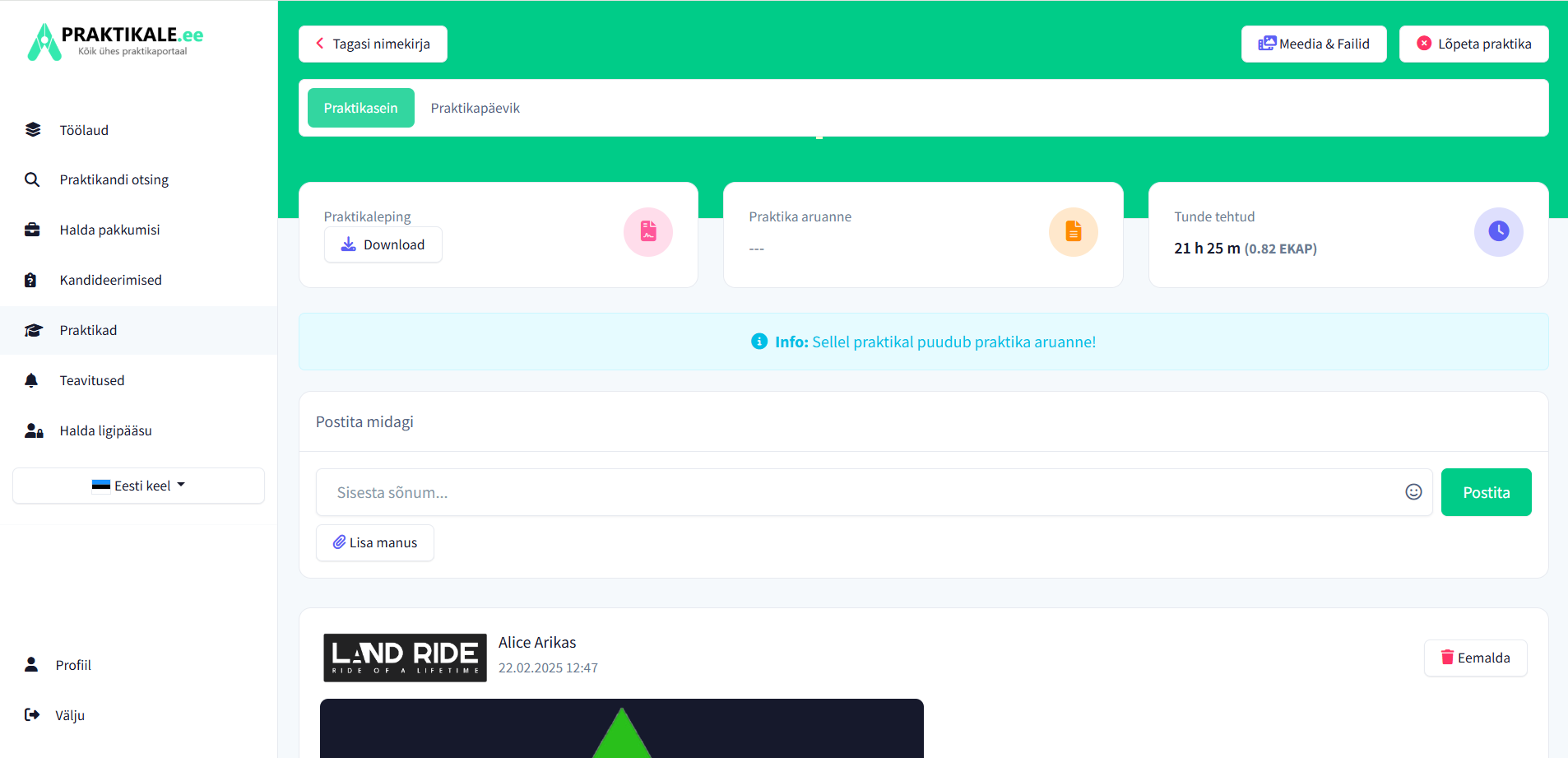Kui praktika on aktiivne, saate ligipääsu õpilase praktikapäevikule, kus saate vaadata edusamme ja anda tagasisidet. Teil on täielik ülevaade nende tegevustest ja sooritusest kogu praktika vältel.